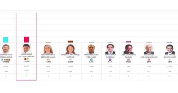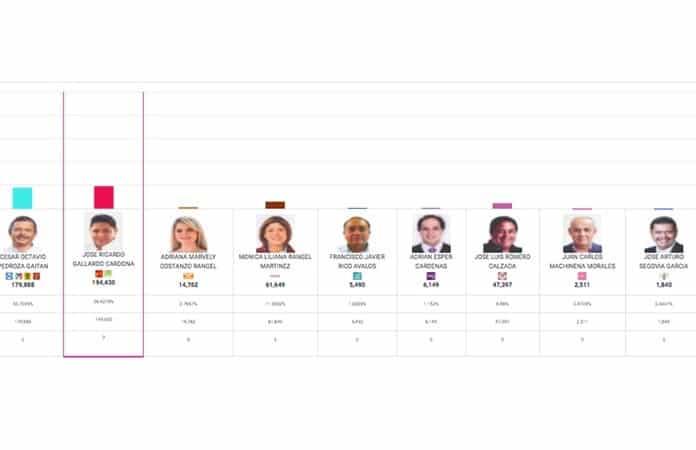 Hasta las 7:00 horas de este lunes, el Programa Estatal de Resultados Preliminares reportaba un avance del 45% en el análisis y 194,430 votos para Ricardo Gallardo Cardona, es decir: 36.4%, contra 33.7% de Octavio Pedroza Gaitán, quien registraba 179,888 sufragios.