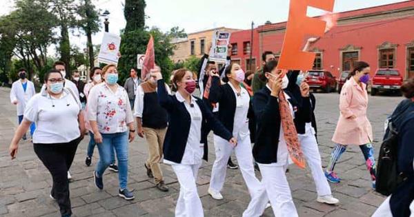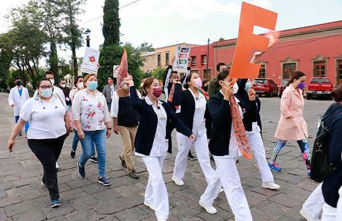 El personal del ISSSTE marchó por la Calzada de Guadalupe, aguantando el frío de la mañana, pero provistos de su obligada vestimenta de trabajo, usualmente de color blanco y algunas combinaciones en azul celeste.