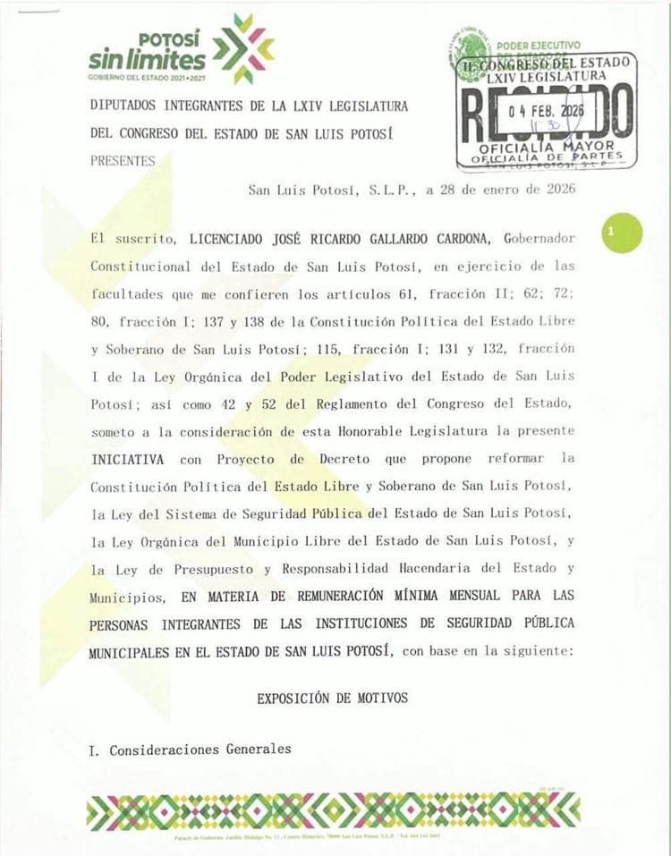 El gobernador de San Luis Potosí, Ricardo Gallardo Cardona, envió formalmente al Congreso del Estado la iniciativa para establecer un salario mínimo de 14 mil pesos mensuales para las y los policías municipales del estado, con lo que la propuesta pasa al trámite legislativo.