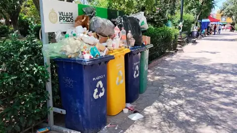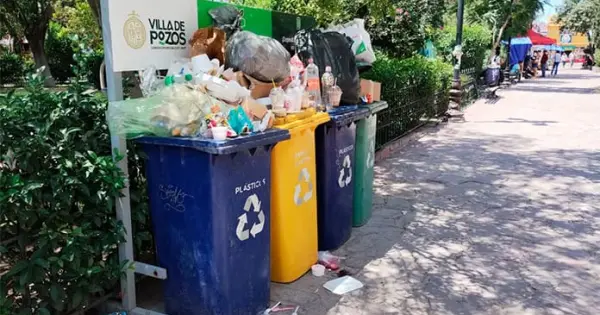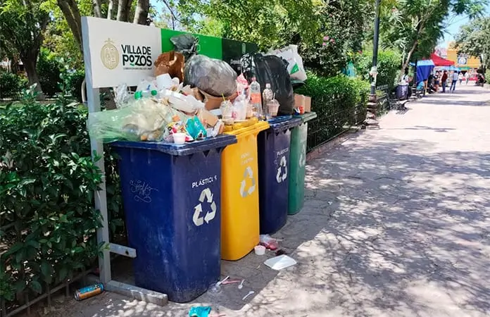 La falta de recolección de basura el fin de semana dejó llenos los depósitos en la plaza principal de Villa de Pozos.