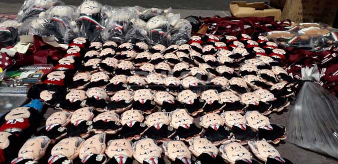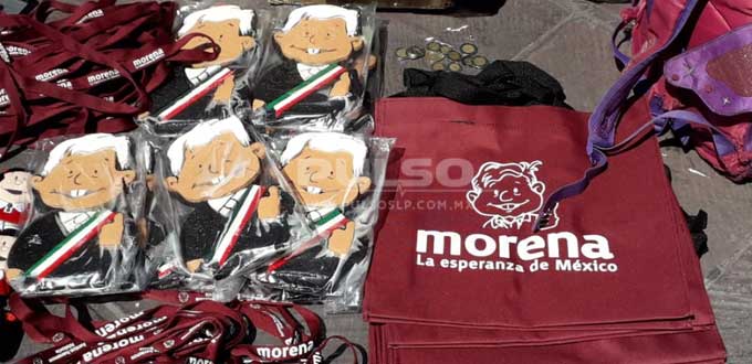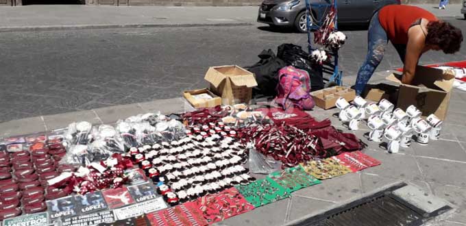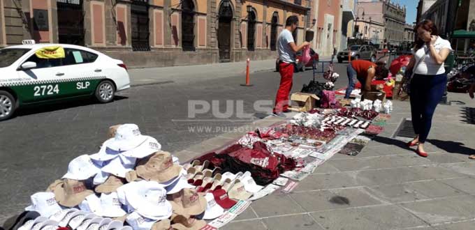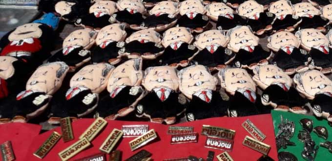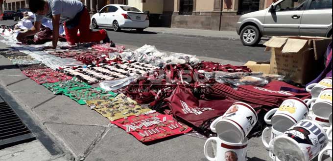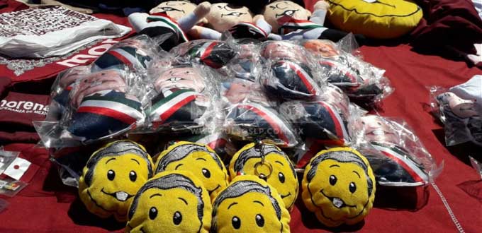 Pines, llaveros, calcomanías, gorras, tazas, monederos, pulseras, bolsas, imanes, sombrillas, almohadas e incluso muñecos de peluche bautizados como los "pejeluches" fueron solo algunos de los productos que este viernes, comerciantes ambulantes ofrecieron en venta en la Plaza de Fundadores, con motivo de la presencia del presidente electo Andrés Manuel López Obrador a San Luis Potosí.