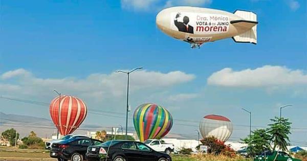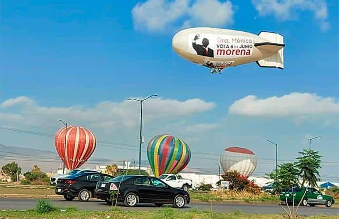 Desde el miércoles y en el transcurso de ayer por la mañana, los globos sobrevolaron el oriente y el Centro Histórico con mensajes proselitistas de la morenista, así como el contorno del mandatario. En semanas anteriores, en el bulevar río Santiago lucía un espectacular con las mismas características.