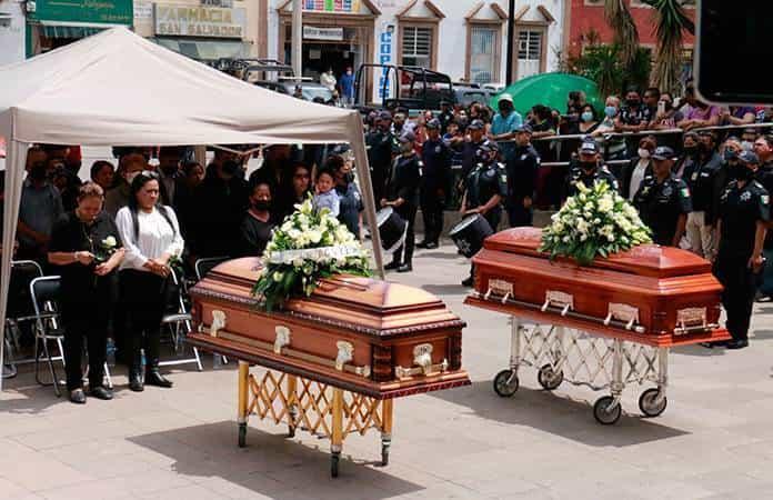 Benito Salazar Coronado y Felipe de Jesús Martínez Alvarado recibieron el último adiós de sus familiares, compañeras y amigos policías, jefes y autoridades estatales en la explanada de la Unidad de Seguridad Pública “Daniel Berrones Meza”, en donde se dijo que la muerte de los dos agentes indigna a la institución policial y a la sociedad, pero obliga también a seguir adelante sin bajar