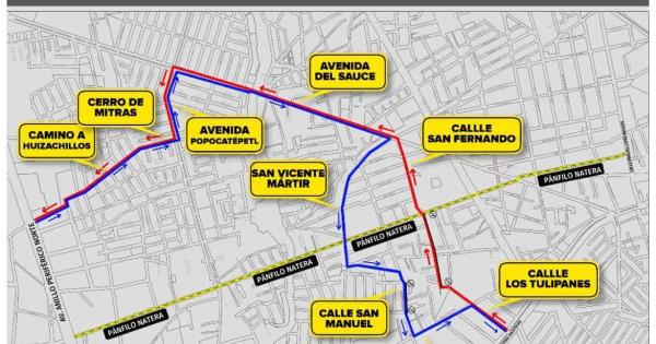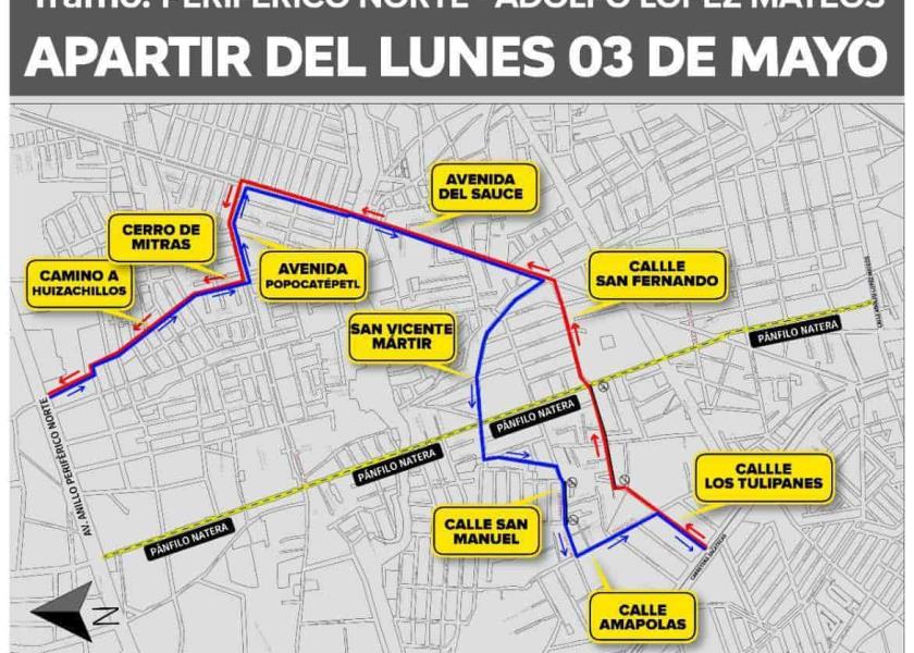 Asimismo para avanzar de Periférico Norte hacia Carretera Zacatecas deberán seguir la siguiente ruta Camino a Huizachillos-Cerro de las Mitras-Av. Popocatépetl-Av. Del Sauce-San Vicente Mártir-San Manuel- Amapolas y Los Tulipanes.