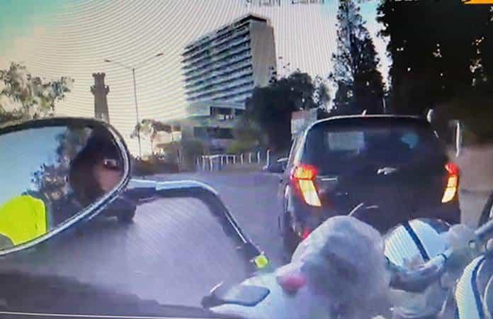 En la versión a partir del video, el oficial se acerca a infraccionar a un vehículo sin placas de circulación ni documentos. La conductora solicitó por teléfono el auxilio de terceros para que no se le aplicara el reglamento; alegó que le querían “quitar el carro afuera de Los Filtros… unos cabrones”.