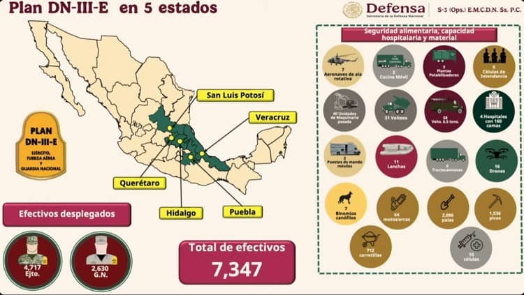 Las autoridades estatales y federales mantienen activos los protocolos del Plan DN-III-E, en coordinación con Protección Civil, a fin de continuar con la atención a las comunidades más afectadas.