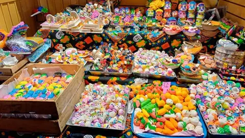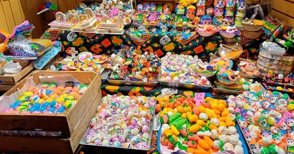 Desde hace 15 días, comerciantes de los mercados llevaron diferentes tipos de dulces, que incluyen las calaveritas de azúcar blanca con sus respectivos remates o gorros de colores fosforescentes, otros tales como la propia calabaza de la forma en que son elaborados los panes de muerto, flores de color rojo, plátanos amarillos, papayas y zanahorias de colores derivados del naranja, naranjas, mandarinas y sandías, algunos bicolores tales como los que simulan ser galletas de flor con relleno rosa de fresa, bolillos y cupcakes de azúcar, platos de pastas color café y de guiso de tomate simulando arroz y frijoles, féretros blancos con figuras de colores y caramelos macizos.