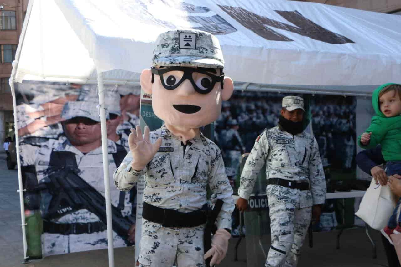 Niños, jóvenes, mujeres y personas adultas se acercaron a tomarse fotos con una botarga de un personaje de la Guardia Nacional, con los carros tanque de la milicia, personajes camuflajeados de arbustos, armamento o con el equipo del Plan DNIII, así como con los elementos de la Guardia Comunitaria.