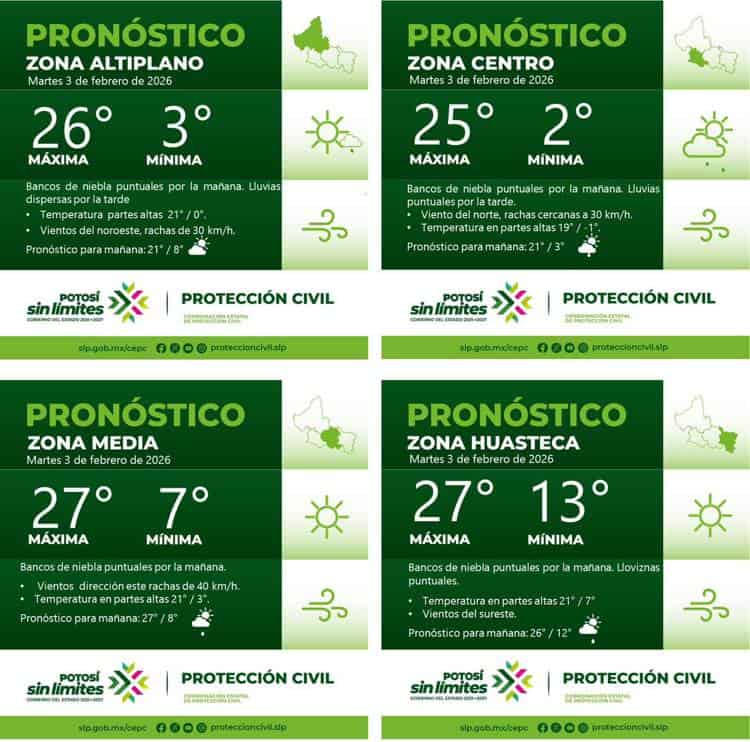 De acuerdo con el pronóstico, las temperaturas máximas alcanzarán 25 °C en la zona centro y 27 °C en la Huasteca, mientras que las mínimas bajarán hasta 2 °C en la zona centro y 3 °C en el Altiplano, principalmente durante la madrugada.
