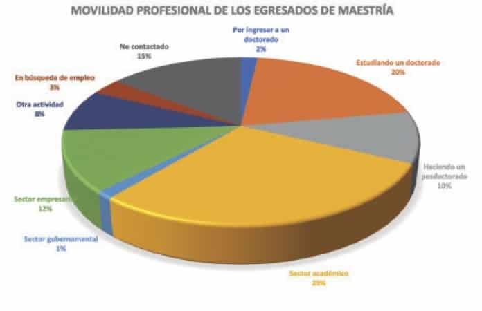 Dado que la formación de los estudiantes de la maestría se realiza en áreas estratégicas, los egresados están preparados para contribuir a la generación del conocimiento, el desarrollo tecnológico y la innovación con impacto para el desarrollo regional y nacional. El porcentaje de egresados ocupados, es decir, empleados en instituciones de educación superior, en el ámbito gubernamental, en empresas o continúan estudios de doctorado es cercano al 90% (Figura 1).