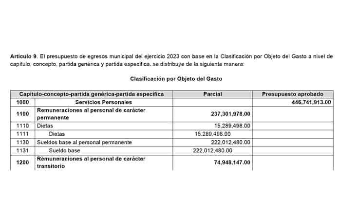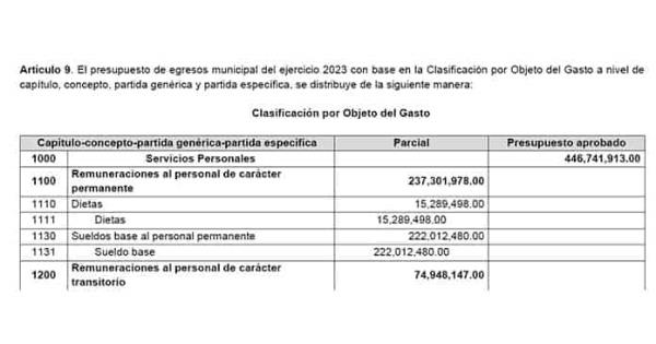 De acuerdo al Presupuesto de Egresos del gobierno municipal, publicado el pasado viernes en el Periódico Oficial del Estado, el presupuesto de este año para el capítulo 1000 del gasto, correspondiente a servicios personales, ascenderá a 446.7 millones de pesos. En 2022, de acuerdo al mismo documento correspondiente de ese año, la suma destinada a la nómina de Soledad fue de 341.2 millones de pesos.