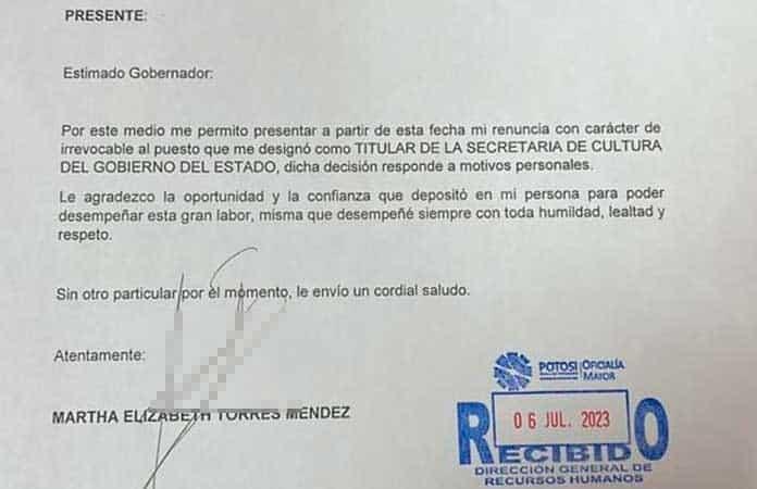 En el documento, Torres Méndez explica que la renuncia se debe a motivos personales y agradece al gobernador Ricardo Gallardo Cardona la oportunidad y confianza depositada en su persona "para poder desempeñar esta gran labor, siempre con toda humildad, lealtad y respeto".
