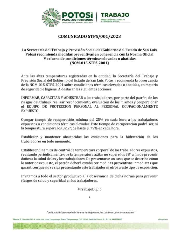 A través de un comunicado oficial, la Secretaría del Trabajo y Previsión Social (STPS) del Gobierno del Estado emitió la recomendación para empresas en general, de informar capacitar y adiestrar a sus trabajadores sobre los riesgos de trabajo que puede ocasionar la actual ola de calor, con base en la Norma Oficial Mexicana NOM-015-STPS-2001.