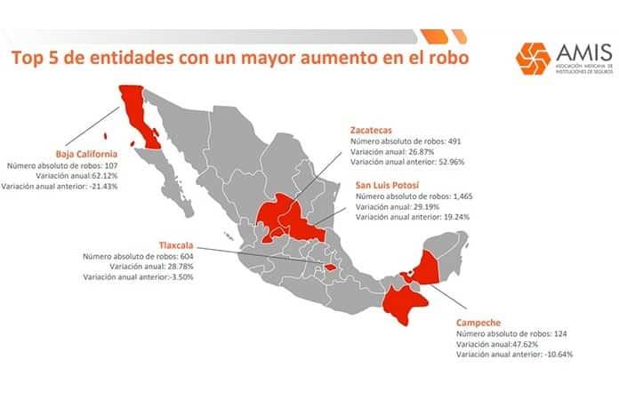 La entidad potosina quedó sólo detrás de Baja California, en donde el robo de unidades aseguradas creció 62.12 por ciento, y de Campeche, en donde el alza fue de 47.62 por ciento.