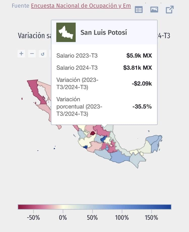 En cuanto al salario mensual, las enfermeras y técnicos en medicina registraron una remuneración promedio de 3 mil 800 pesos, 35.5 por ciento menos que en tercer trimestre del 2023 cuando se registró un promedio de 5 mil 900 pesos, de igual forma esta cifra posiciona a la entidad como uno con las peores remuneraciones para este sector laboral.