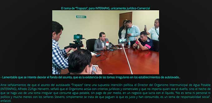 El 20 de abril, durante una conferencia de prensa, el titular del Organismo Intermunicipal Metropolitano de Agua Potable, Alcantarillado y Saneamiento (Interapas), Alfredo Zúñiga Herverth, fue tajante al asegurar que el castigo para la empresa de lavado de autos “El Trapazo” sería ejemplar: multa y sanción administrativa por utilizar tomas clandestinas por las cuales obtenían agua que no era registrada por el organismo para cobrar el consumo.