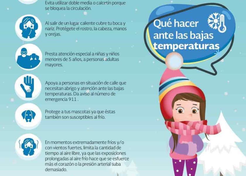 El funcionario pidió a la población tomar en cuenta algunas recomendaciones para evitar enfermedades y accidentes tales como no usar anafres en espacios cerrados, revisar los calentadores tanto de gas como eléctricos antes de usarlos, taparse boca y nariz al pasar de un ambiente cálido a uno frío y tener especial cuidado con menores de 6 años, personas adultas mayores de 65 y personas con enfermedades respiratorias crónicas.