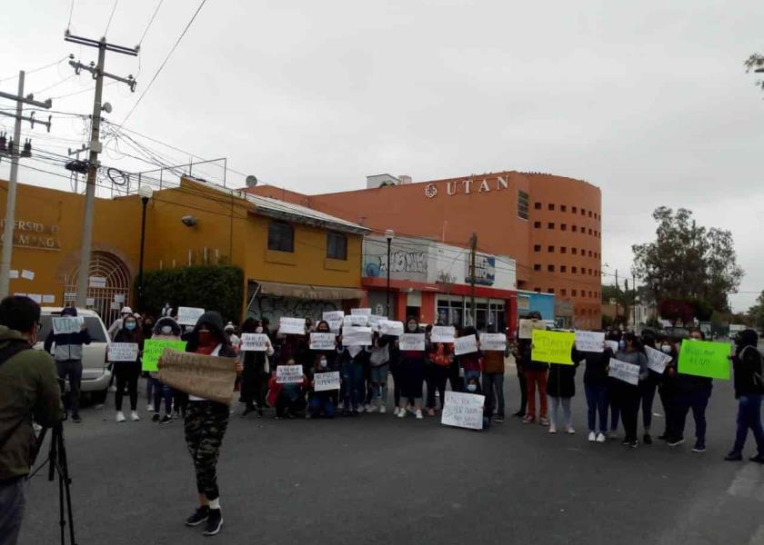 Estudiantes de la Universidad Tangamanga (Utan) protestaron afuera del plantel ubicado en el sector de El Saucito por incrementos a las cuotas de inscripción y mensualidad que les cobra la institución, de los cuales afirman que son aumentos injustificados.