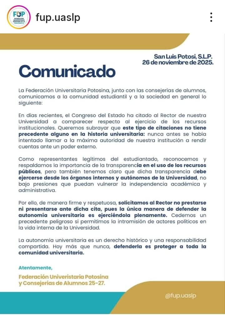 La Federación Universitaria Potosina y las consejerías de alumnos de la Universidad Autónoma de San Luis Potosí (UASLP) lanzaron un llamado público ante la inusual citación realizada por el Congreso del Estado de San Luis Potosí al rector de la casa de estudios, para que comparezca por el uso de recursos institucionales.