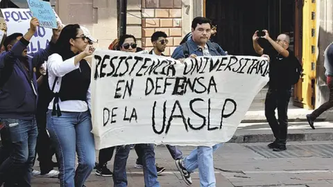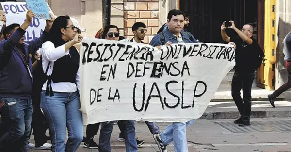 Alrededor de 70 estudiantes de diferentes facultades de la UASLP arribaron a Palacio de Gobierno del Estado con pancartas en contra de la administración estatal, en cuyos mensajes no sólo reclamaron los pagos pendientes, sino también la falta de exigencia de las autoridades universitarias.