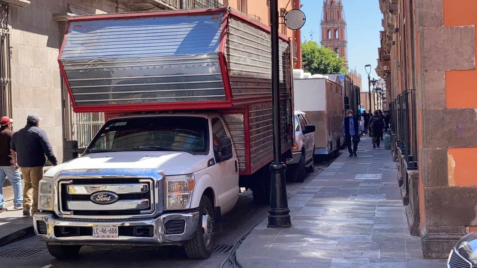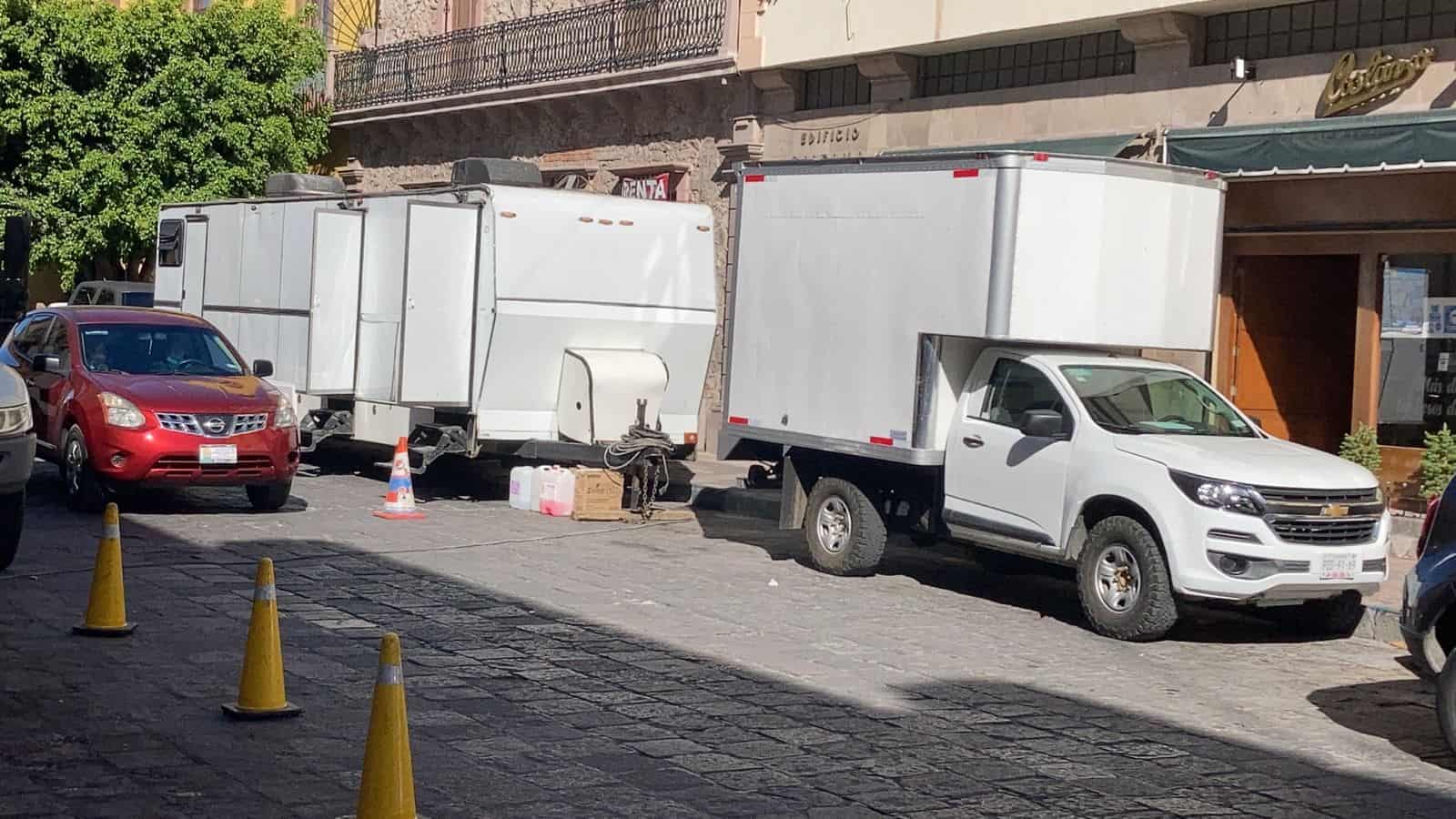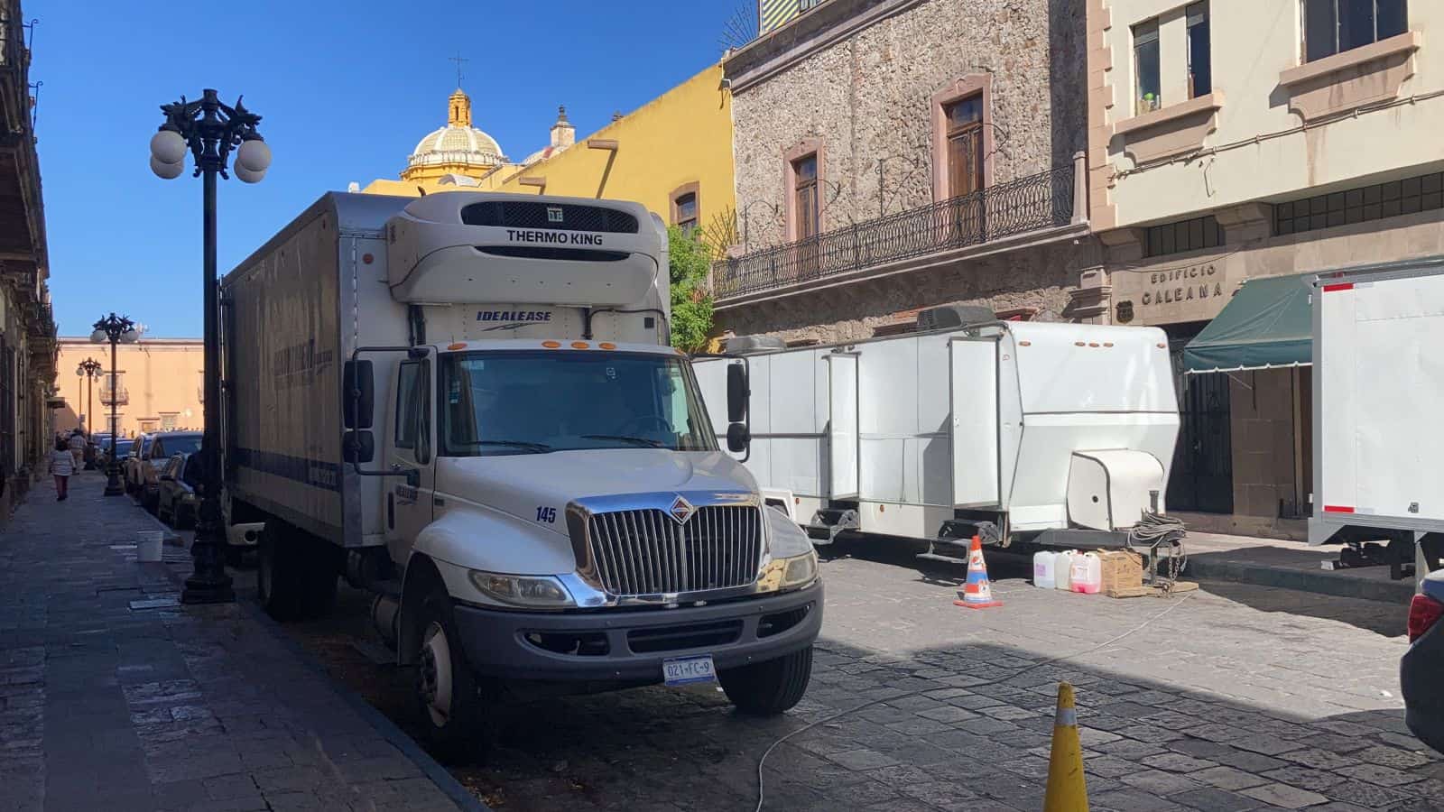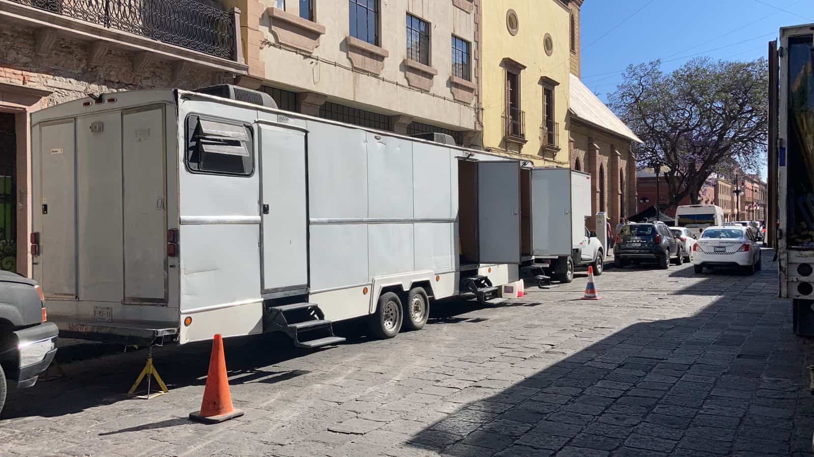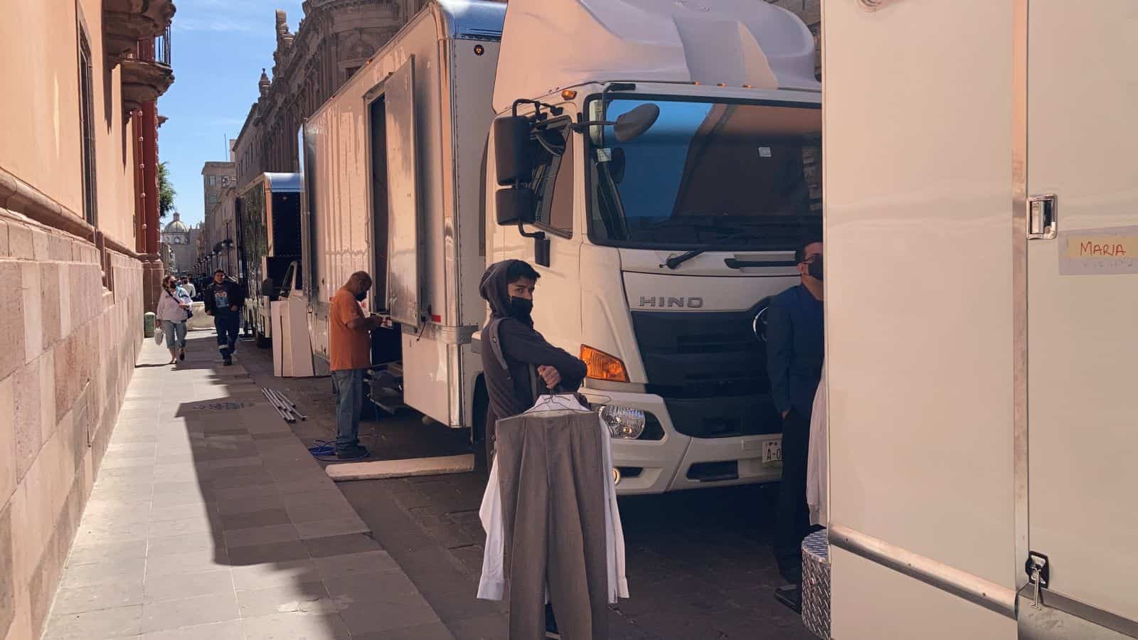 Sobre la calle Díaz de León se estacionó otro cámper, mientras que en las calles Madero y Allende, atrás de Palacio de Gobierno, se ubicaron dos camionetas y un tercer vehículo para cambios de ropa, a donde acudieron principalmente jóvenes, tanto hombres como mujeres, que participarán como extras en la grabación.