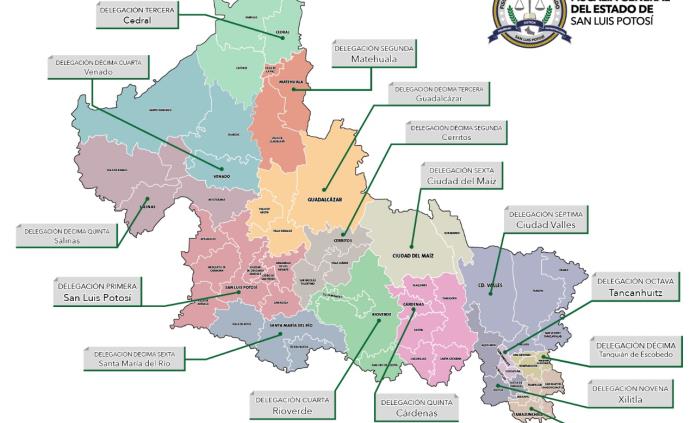El Fiscal explicó que la conformación de las 16 delegaciones quedará de la siguiente manera: la *primera* tendrá su sede en la cabecera municipal en *San Luis Potosí* capital y atenderá además a los municipios de Villa de Arriaga; Ahualulco; Armadillo de los Infante; Soledad de Graciano Sánchez; Cerro de San Pedro; Mexquitic de Carmona y Zaragoza, nombrando a Juan Gutiérrez Espiricueta como su titular.