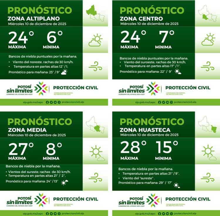 De acuerdo con el pronóstico, las temperaturas máximas alcanzarán 24°C en la zona Centro y 28°C en la Huasteca. Las mínimas bajarán hasta 7°C en la zona Centro y 6°C en el Altiplano, por lo que la autoridad pidió extremar precauciones.