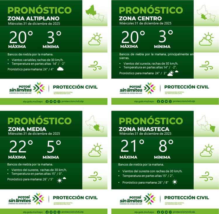 De acuerdo con el reporte climatológico emitido por instancias estatales, en la zona centro se registraron temperaturas máximas cercanas a los 20 grados centígrados, mientras que en la región Huasteca alcanzaron hasta los 21 grados.
