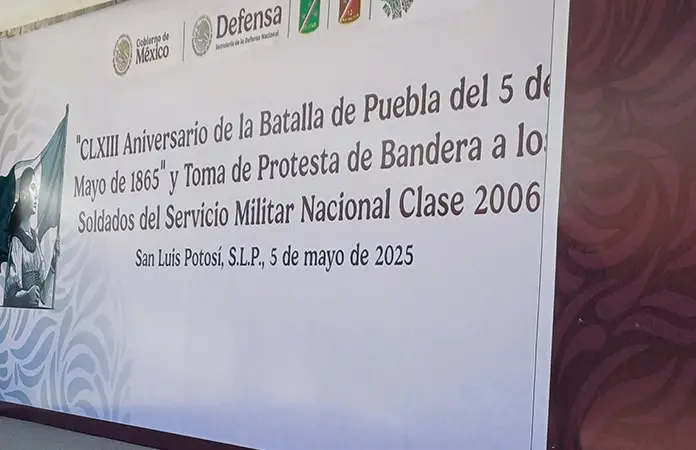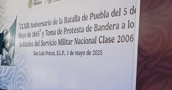 En ella, se lee “CLXIII Aniversario de la Batalla de Puebla del 5 de Mayo de 1865 y Toma de Protesta de Bandera a los Soldados (sic) del Servicio Militar Nacional Clase 2006”.