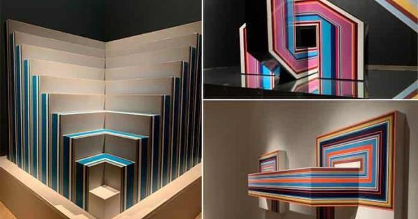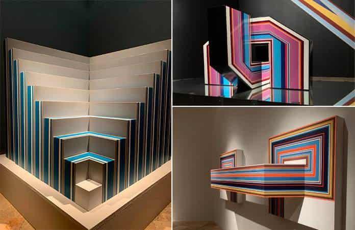 La obra de Francisco Moyao en la exposición Geometría Colorida, que exhibe 20 magníficas piezas que forman parte de la colección Pago en Especie que se encuentra en los acervos y colecciones de la Secretaría de Hacienda y Crédito Público, se exhibe en el museo Federico Silva Escultura Contemporánea.