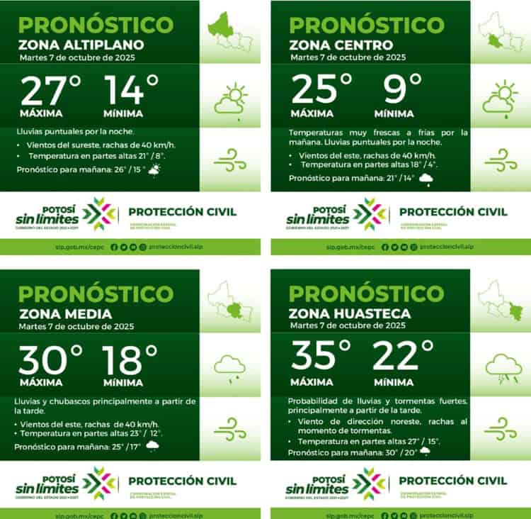 La Coordinación Estatal de Protección Civil (CEPC) informó sobre el pronóstico climático para el estado de San Luis Potosí este martes.