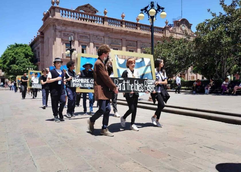 Todo un museo viviente -e itinerante- de las grandes obras pictóricas recorrió este miércoles la Plaza de Armas y de Fundadores, en una actividad inédita en la que participaron estudiantes del Instituto Cervantes Apostólica, docentes, directivos y personal del Instituto de Cultura de San Luis Potosí.