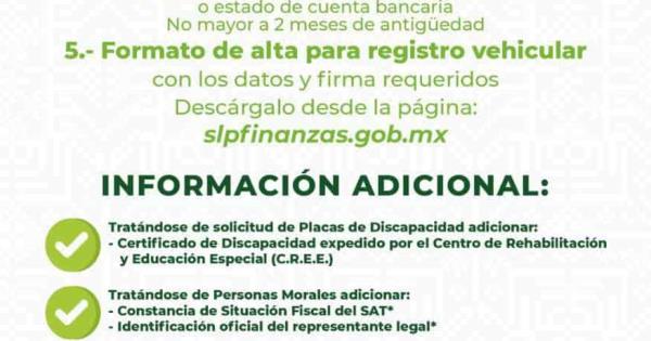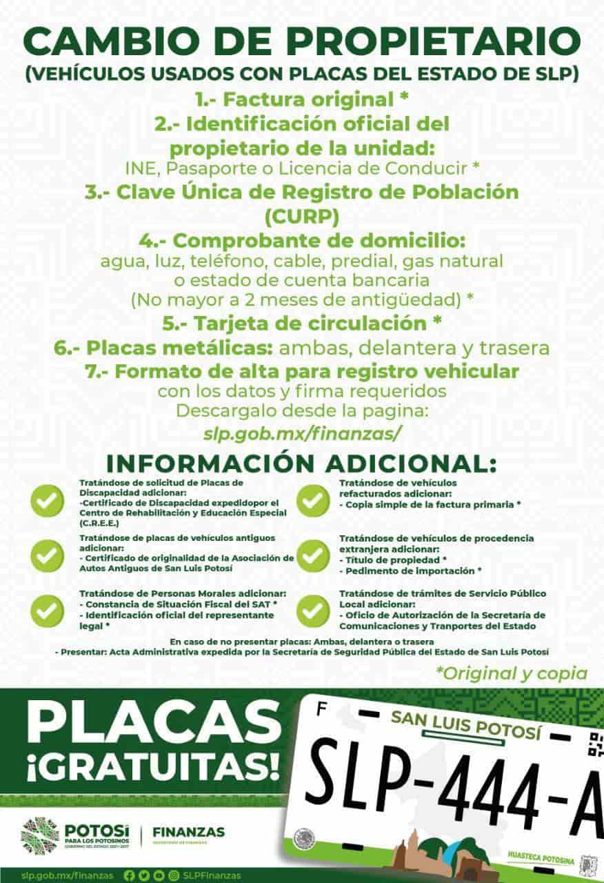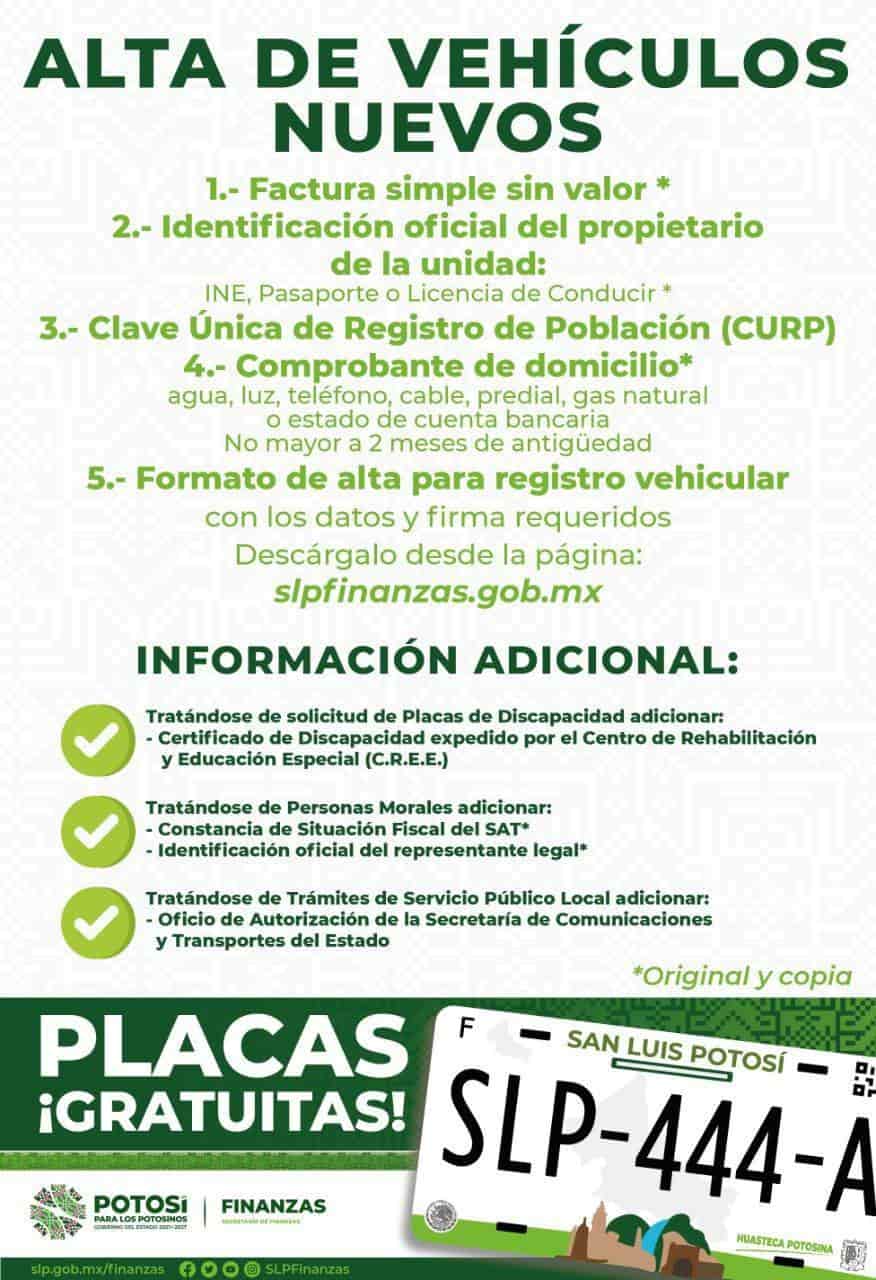 En esta primera etapa, podrán tramitar las placas gratuitas propietarios de vehículos nuevos y quienes requieran cambio de propietario de unidades de menos de 500 mil pesos de valor en factura con placas de San Luis Potosí. Entre éstos, propietarios de remolques, motocicletas y motonetas de hasta 350 c.c. de cilindro.