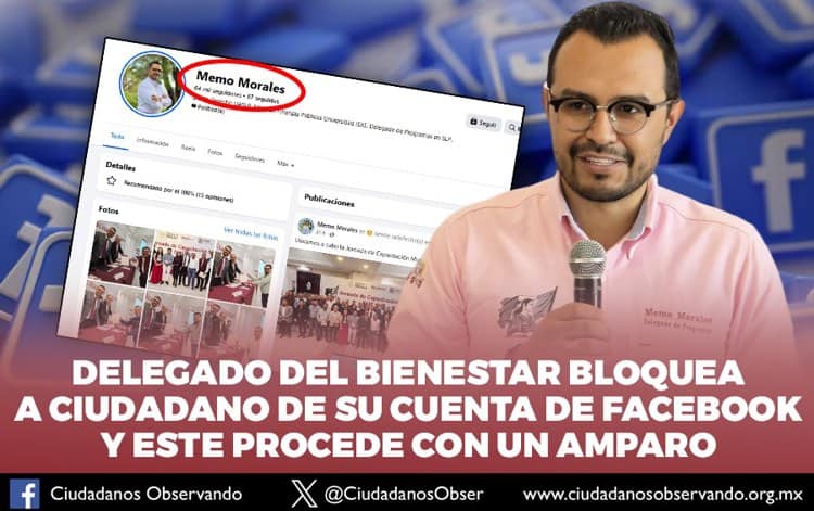 La organización Ciudadanos Observando difundió un caso en el que un ciudadano fue bloqueado en Facebook por el delegado estatal de Programas para el Bienestar en San Luis Potosí, Guillermo Morales López, lo que derivó en la promoción de un amparo ante la justicia federal.
