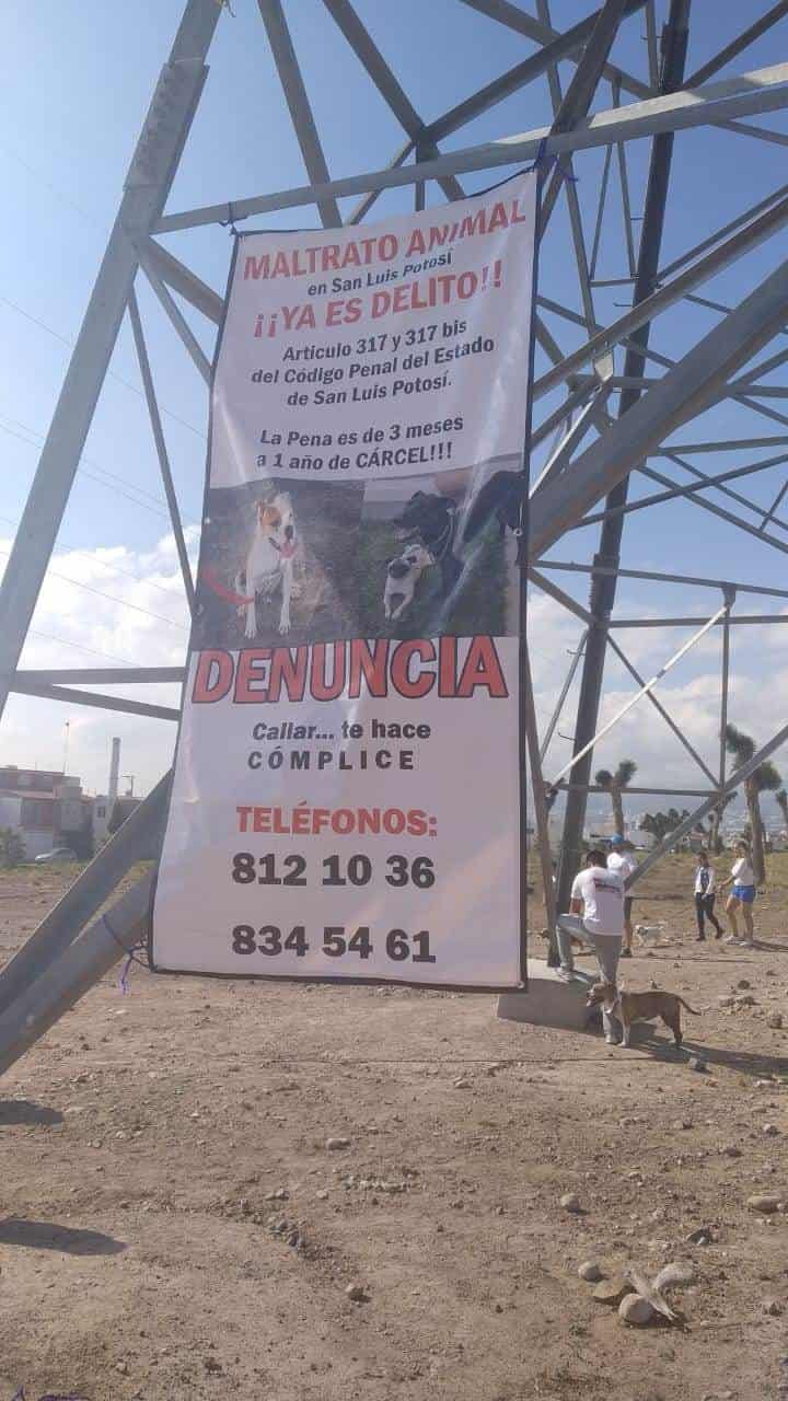 En una antena de alta tensión eléctrica colocaron una lona con dimensiones de alrededor de dos metros de ancho por cinco de largo, en la cual se leía: “Maltrato en San Luis Potosí ¡Ya es delito! Denuncia, callar… te hace cómplice”´.