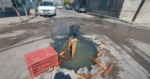 Mediante un recorrido se observó agua estancada a lo largo de la vialidad, con escurrimientos que recorren varios metros de la calle y forman charcos de color oscuro, presuntamente de aguas residuales. En uno de los puntos, los propios vecinos colocaron cajas y objetos para advertir a automovilistas y peatones sobre el hundimiento y el encharcamiento.