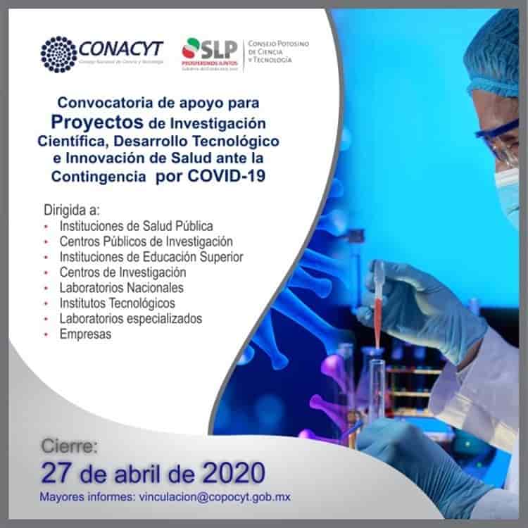 El Consejo Potosino de Ciencia y Tecnología (COPOCYT), invitó a la comunidad académica, empresarial y gubernamental, a participar en la convocatoria 2020-01 del Consejo Nacional de Ciencia y Tecnología (CONACYT) de Apoyo para Proyectos de Investigación Científica, Desarrollo Tecnológico e Innovación en Salud ante la Contingencia por COVID-19.