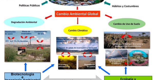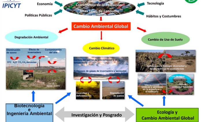 El cambio climático se investiga mediante monitoreo, estrategias experimentales o modelación, el que se busca conocer su impacto en el crecimiento y desarrollo de poblaciones naturales de plantas y animales; en este caso, se ha estudiado el efecto de calentamiento sobre la germinación de semillas de encinos en diversos bosques. También se examina el efecto del cambio climático en la distribución de las especies y en aspectos antropogénicos como la producción de alimentos a través de la agricultura de temporal. La emisión de gases de efecto invernadero y de contaminantes de diversa índole se analiza y estudia su impacto en poblaciones naturales de animales, por ejemplo, el daño de la contaminación en el estado de la salud y la susceptibilidad a enfermedades en poblaciones de aves. También se trata de identificar los microorganismos del suelo en diversos ecosistemas y se examina su papel como estimuladores del crecimiento de plantas, para eventualmente generar biofertilizantes para la agricultura.