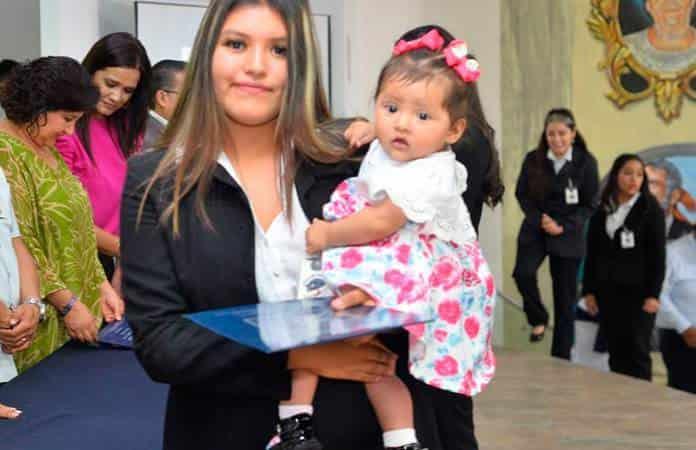 Evelyn Andrea Monjarás Vázquez, de 17 años edad, recibió ayer su certificado de preparatoria acompañada de su bebé de tan solo siete meses de edad, la joven estudiante se dijo orgullosa de concluir sus estudios, pese a la demanda de tiempo que requiere cuidar a su pequeña Mia Isabella, a quien incluso tuvo que llevar en brazos mientras atendía las clases.