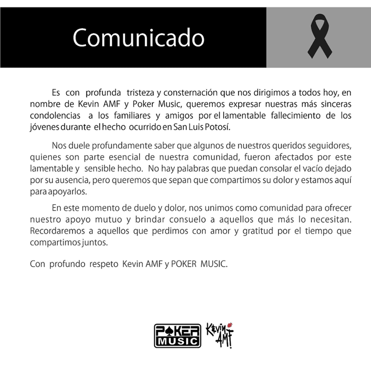 Kevin Alan Moreno Franco, mejor conocido como Kevin AMF, tardó aproximadamente 12 horas en emitir un comunicado en el que expresó su consternación por lo sucedido. En sus palabras, mostró profundo pesar y solidaridad con las víctimas y sus familias.