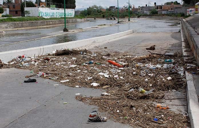 Un cumulo de basura doméstica, ramas y troncos de árboles fue parte de lo que arrastró la lluvia del pasado fin de semana sobre la zona metropolitana de San Luis Potosí, y que quedó esparcida en uno de los accesos al Río Santiago a la altura del puente de la carretera a Matehuala.