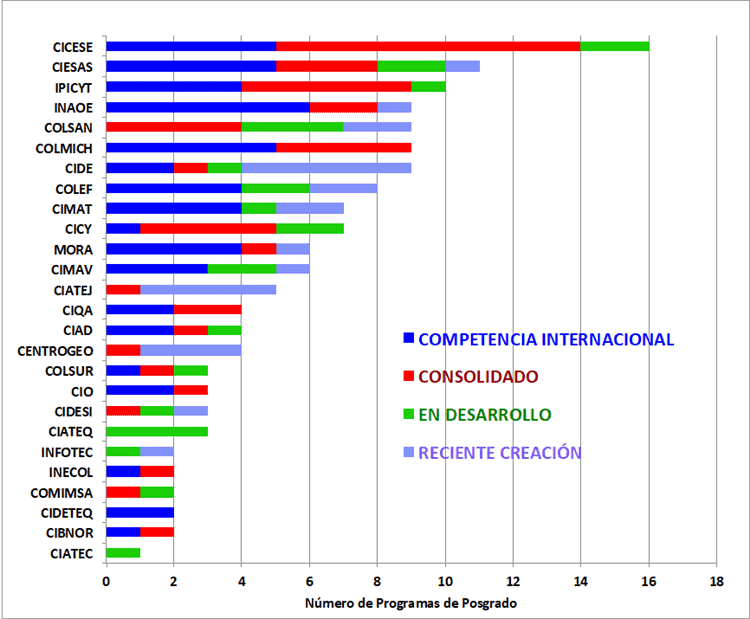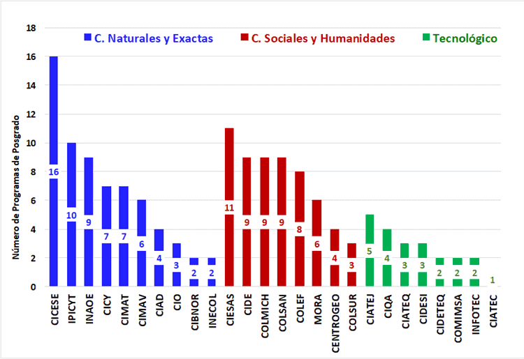 Infraestructura Humana. En cuanto a la infraestructura humana, los 24 CPI que proporcionaron información cuentan con 2,825 investigadores en total que pueden participar en los programas de posgrados, además de disponer del apoyo de 2,031 Técnicos Académicos para brindar atención personalizada a los estudiantes en los laboratorio o en el trabajo de campo. Los centros de Ciencias Exactas y Naturales, así como los de Ciencias Sociales y de Humanidades imparten el mayor número de posgrados, en tanto que los Centros Tecnológicos se centran más en prestar servicios a los usuarios ofreciendo menos programas de posgrado.