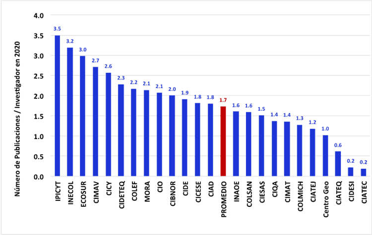 Gráfica 3. Publicaciones científicas por investigador en 2020, en los Centros Públicos de Investigación