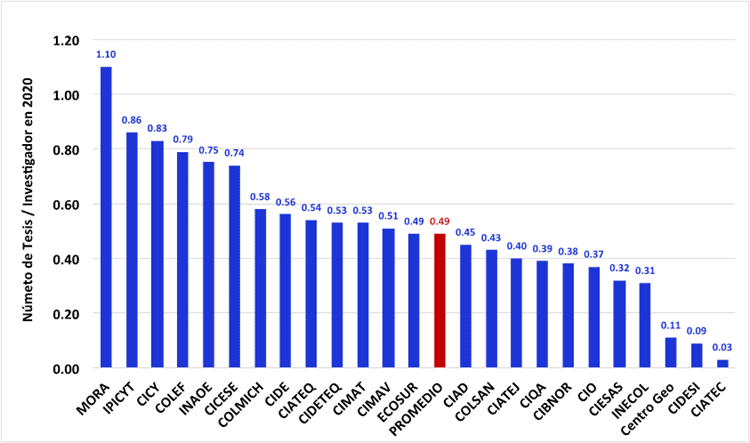 Gráfica 4. Tesis finalizadas de Maestría y Doctorado por investigador en los Centros Públicos de Investigación, 2020