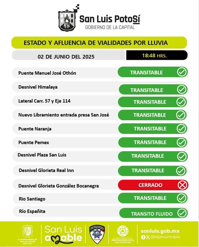Hasta el momento, el único cierre vial confirmado es el paso a desnivel de la glorieta González Bocanegra, donde el acumulamiento de agua ha hecho intransitable el acceso. Asimismo, se reporta que las lluvias ya han alcanzado el primer cuadro de la ciudad, complicando la circulación en calles del Centro Histórico.