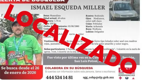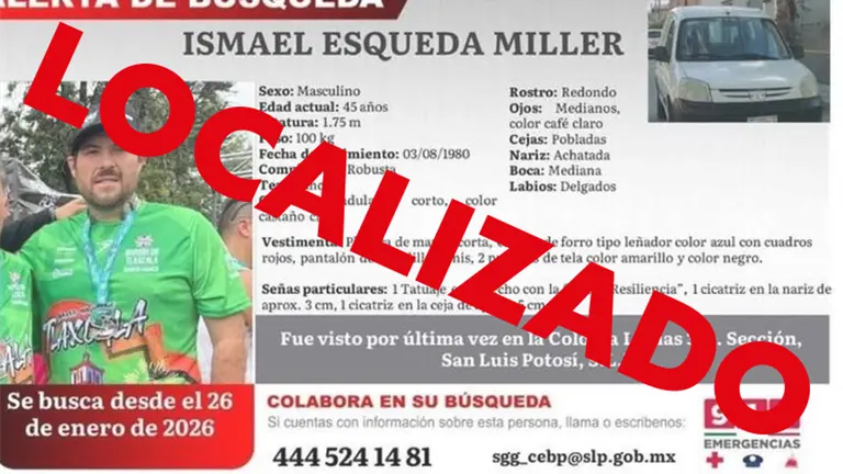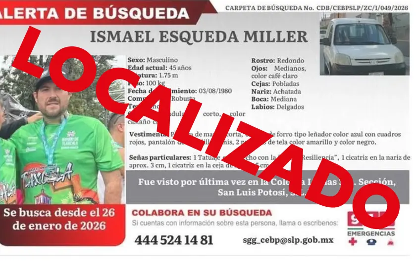 La Comisión Estatal de Búsqueda de Personas de San Luis Potosí informó que Ismael Esqueda Miller, quien contaba con una ficha de alerta por desaparición, ya fue localizado, a menos de 24 horas de que se emitiera el reporte.