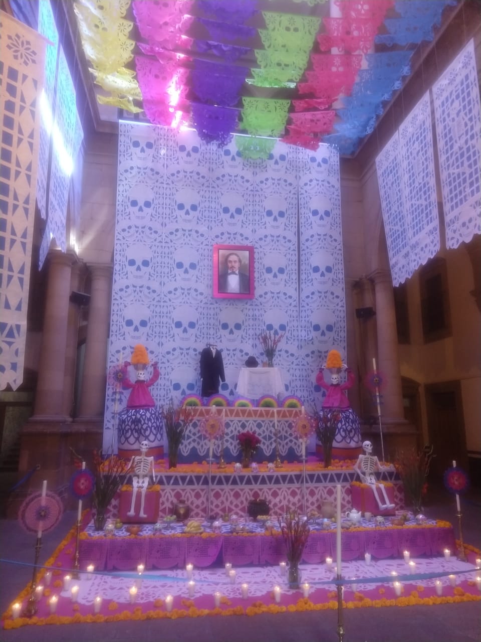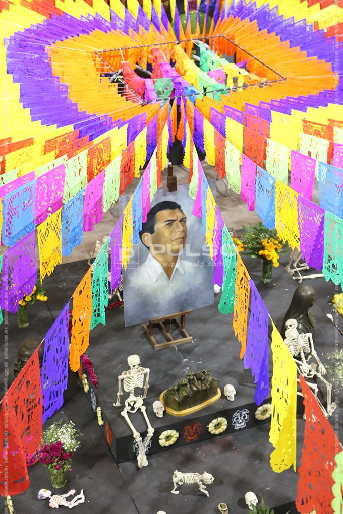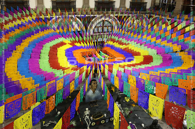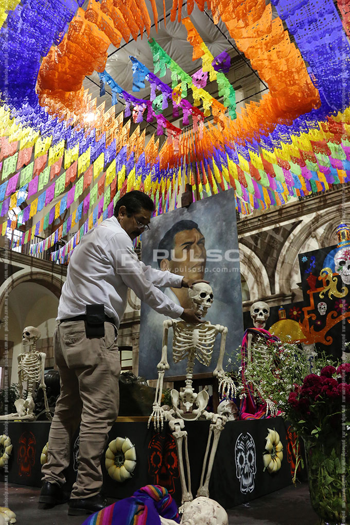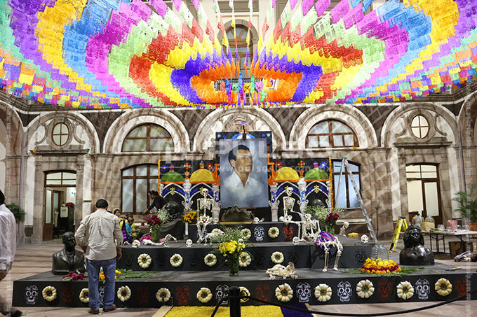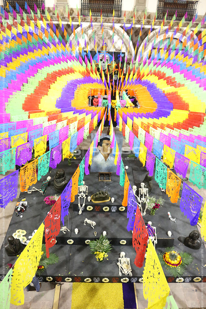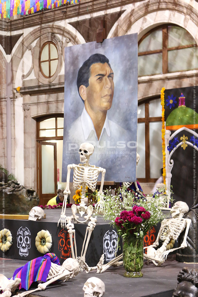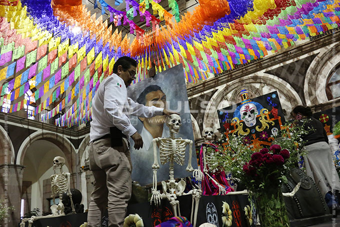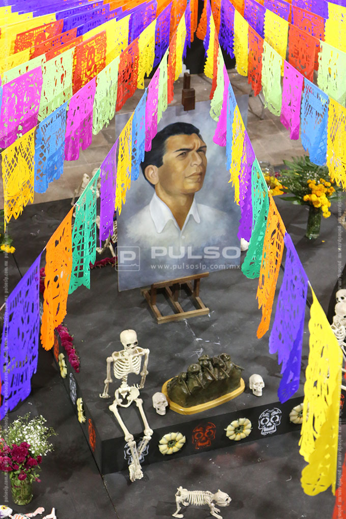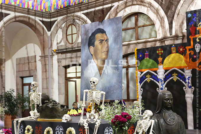 El altar de Día de Muertos instalado en Palacio de Gobierno, esta dedicado al artista Joaquín Arias, consagrado como uno los máximos exponentes de la escultura en San Luis Potosí.