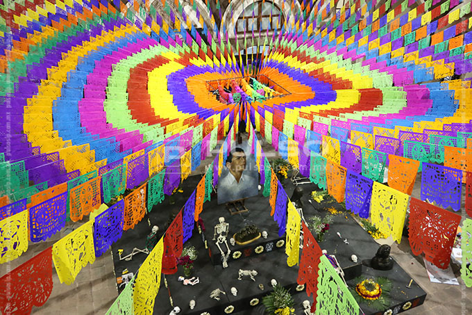 El altar se encuentra coronado con un retrato al óleo de Joaquín Arias, y rematado por un cielo muticolor elaborado en papel picado.