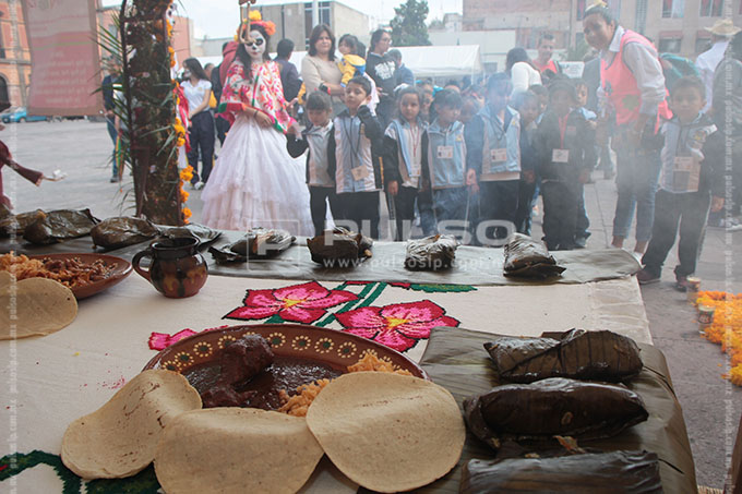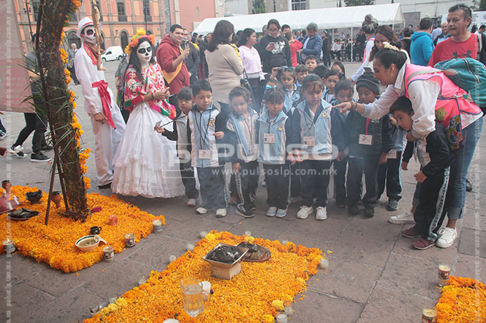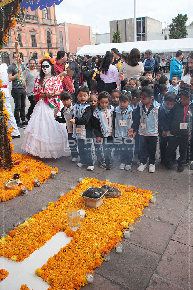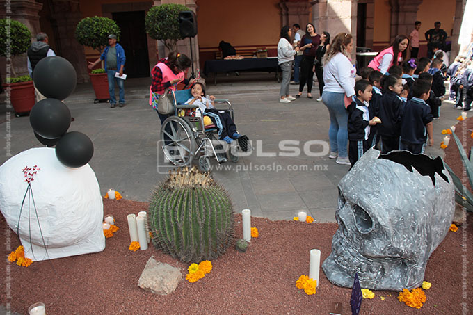 En la plaza de Fundadores, el Sistema Educativo Estatal Regular (SEER) realiza el concurso de altares, por lo que estudiantes de bachillerato colocaron diversas instalaciones con características típicas de las cuatro regiones geográficas de San Luis Potosí.