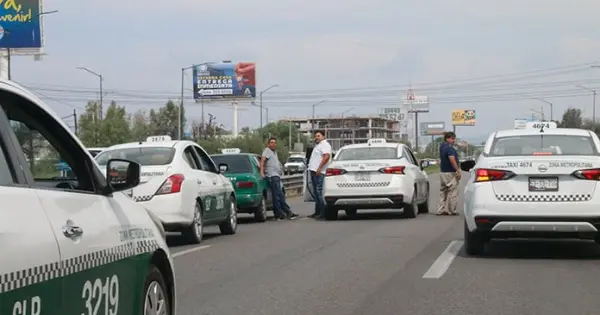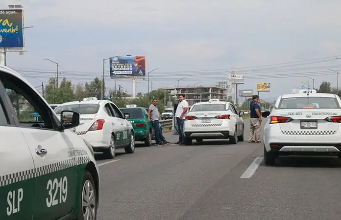 Los taxistas iniciaron su protesta luego de concentrarse frente a la Terminal Terrestre Potosina y de ahí avanzaron por los carriles centrales de la carretera 57 hasta el Eje 140 de la Zona Industrial.
